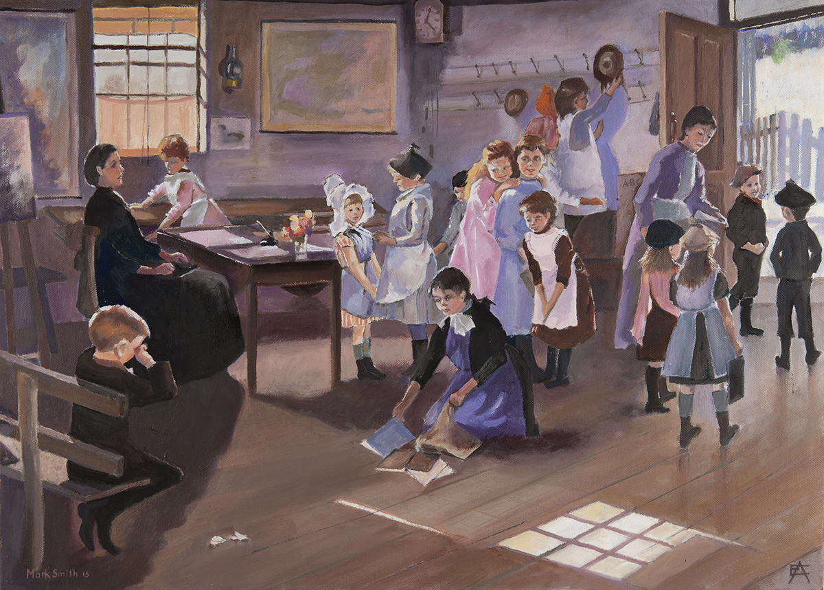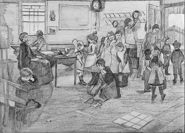 As I painted them, I became absorbed in each person, I even invented names for some of them: Job, Tilda, Ruth, Eppy, Lizzy, Dick . . . ! Why is the boy crying, what had he done wrong? Why are the heartless girls laughing at him? Who had dashed books and papers on to the floor? The girl on her knees is trying to restore some order. The lads by the door want to get away smartly! The girl in the bonnet is getting some TLC – is she a bit upset?